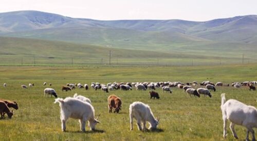 モンゴルの農場滞在中に、朝、子供たちと裏山に登った。 裏山の頂上からバイヤンチャエンダマン市を望む。 山にはきれいな花々が咲いていた。