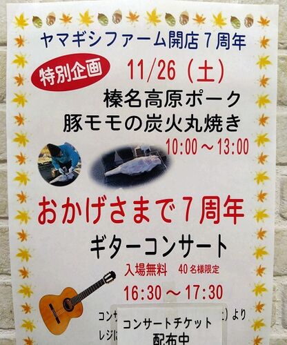 今月11月で7周年を迎えたファーム町田店。 今月は土曜日にいろいろとお客さんに感謝の意を込めてイベントを催している。 今月最後の土曜日26日は、味わいひろばでは「豚モモの炭火焼きと豚汁の振る舞い」と、「五平餅の販売」をした。 そして夕方4時半から…