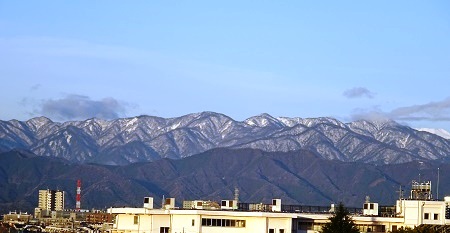 朝起きて屋上に上がったら、遠くに望める丹沢の山々は、昨日降った雪が朝日に白く輝いていた。