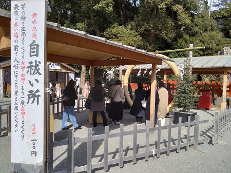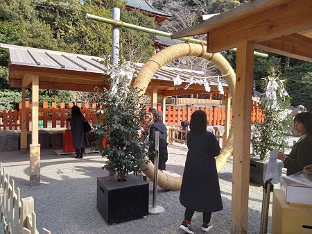 自身で大きな茅の輪をくぐってお祓いができるようになっている。
