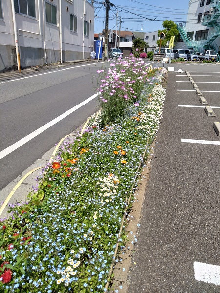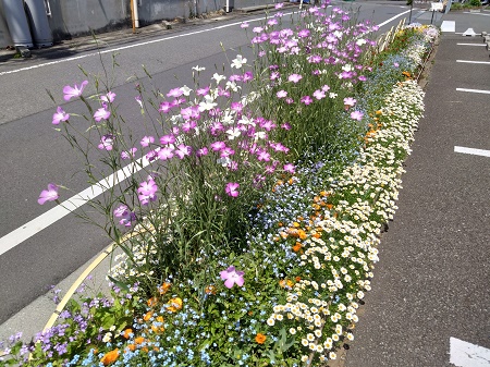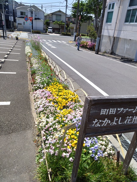 町田市が「市民の手づくりによる花壇の草花が街を彩る企画」として、希望する市民や団体に、花の苗を提供して、それを植えた花壇の出来映えを審査する「花壇コンクール」に参加している、我がファーム町田店の駐車場脇の「なかよし花壇」。