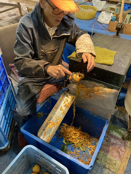 一個一個、丁寧に剥いて・・、紐に付けて乾燥・・・。